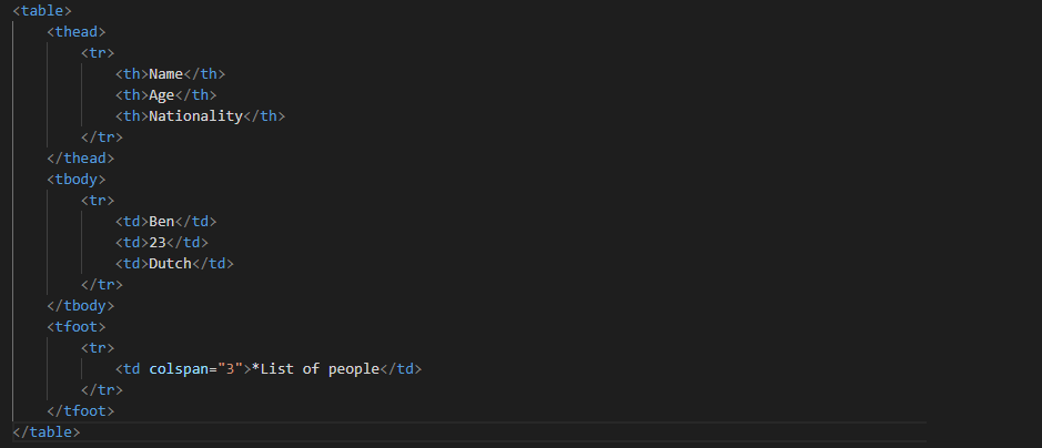 *Example of a table. Containing a list of people and ordering them by Name, Age and Nationality.